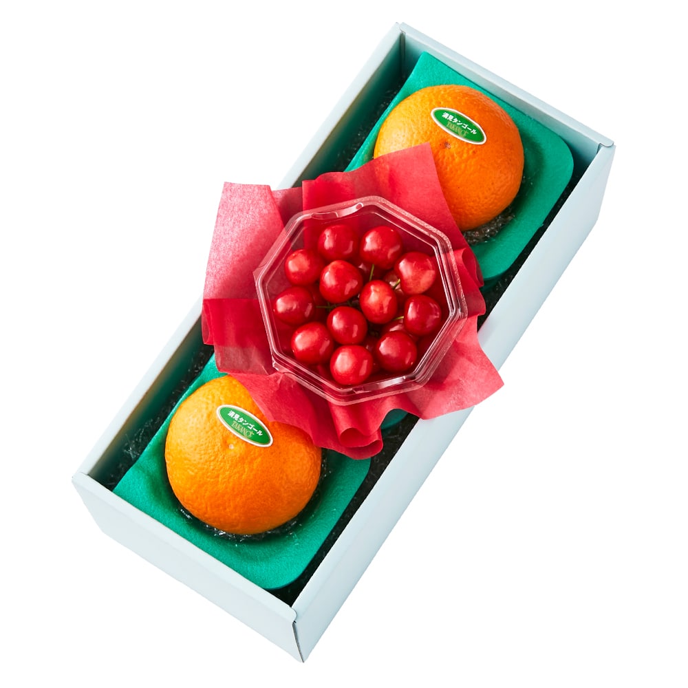 | 内容量 | さくらんぼ約100g入(山梨県、山形県または長野県産)×1、清見オレンジ(愛媛県または佐賀県産)×2 |