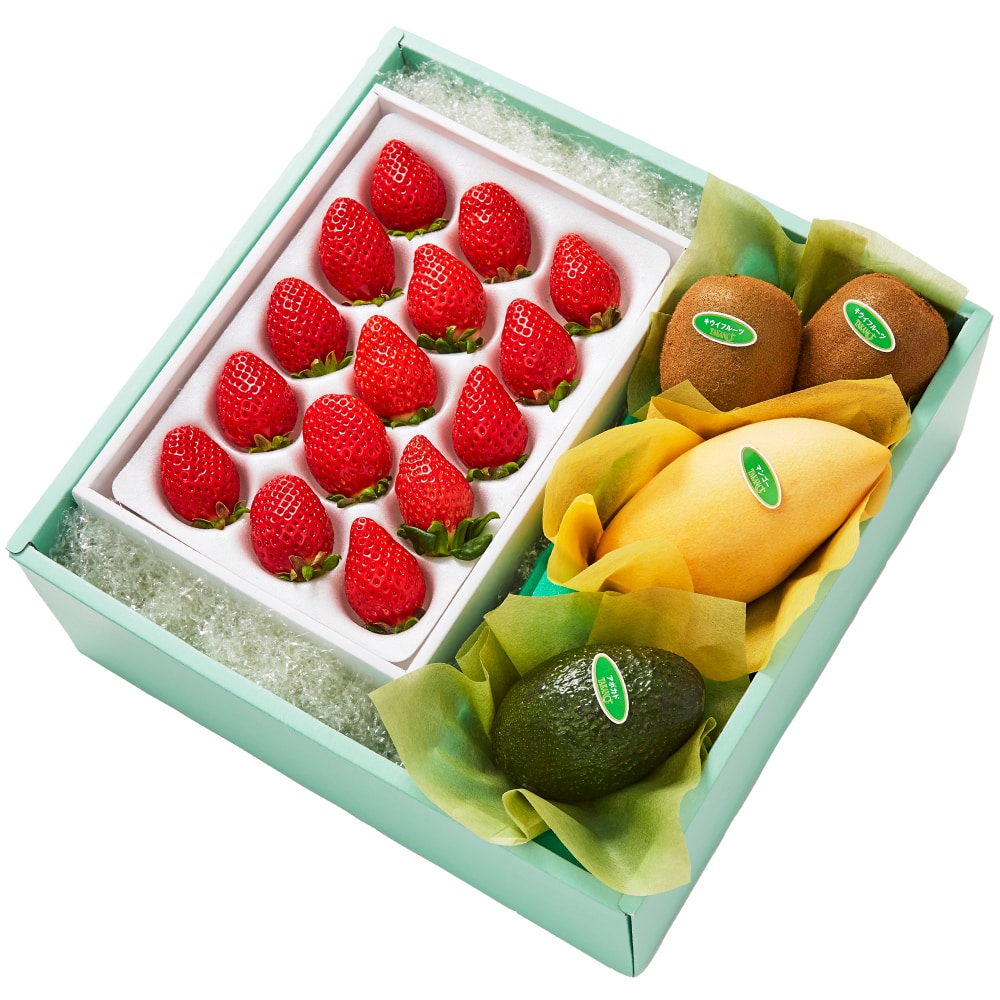| 内容量 | べにたま苺15粒(埼玉県産)×1、タイマンゴー(タイ産)、アボカド(メキシコまたはチリ産)×各1、キウイフルーツ(ニュージーランド、山梨県、愛媛県または和歌山県産)×2 |