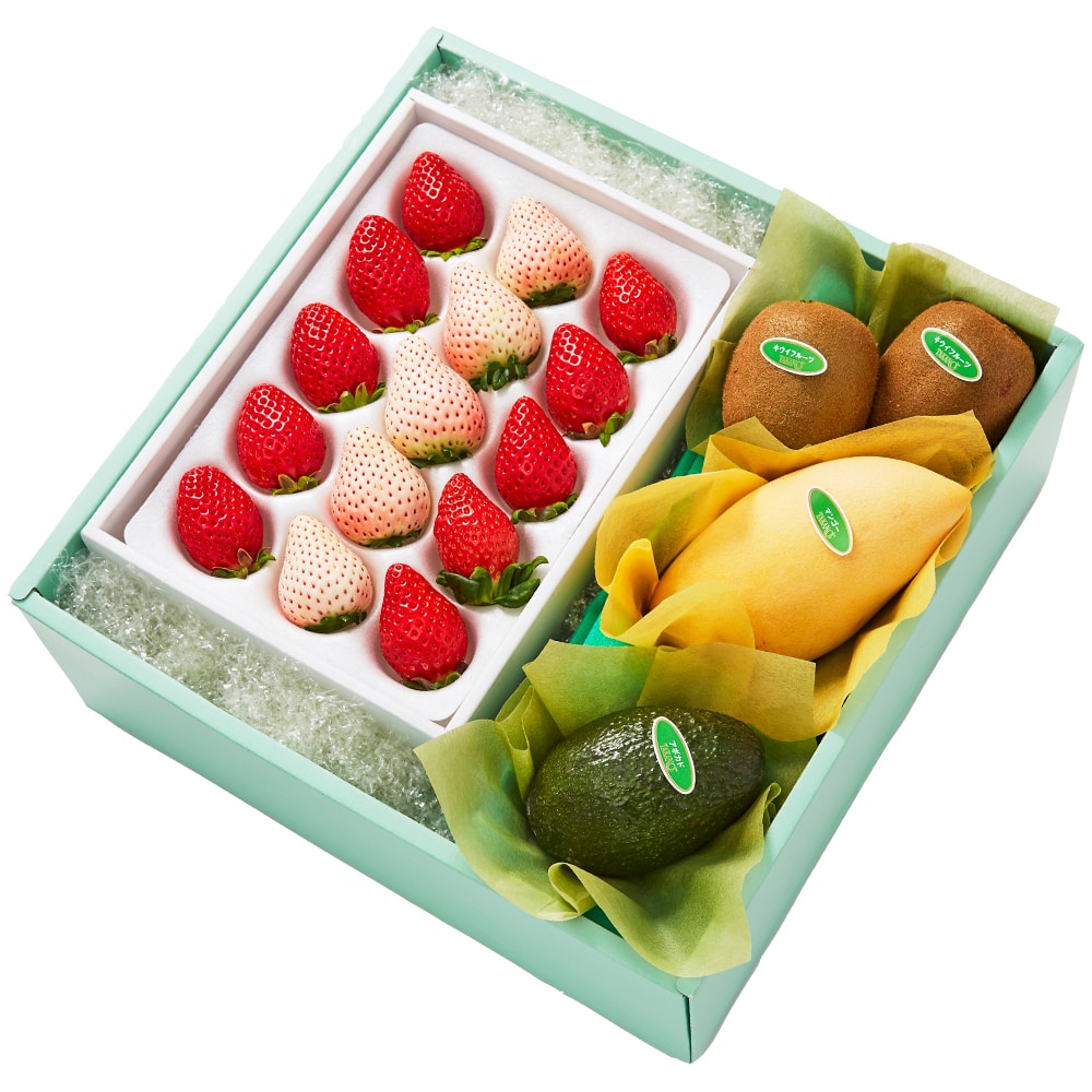 | 内容量 | べにたま苺10粒(埼玉県産)、初恋の香り5粒(静岡県産または和歌山県産)×1、タイマンゴー(タイ産)、アボカド(メキシコまたはチリ産)×各1、キウイフルーツ(ニュージーランド、愛媛県または和歌山県産)×2 |