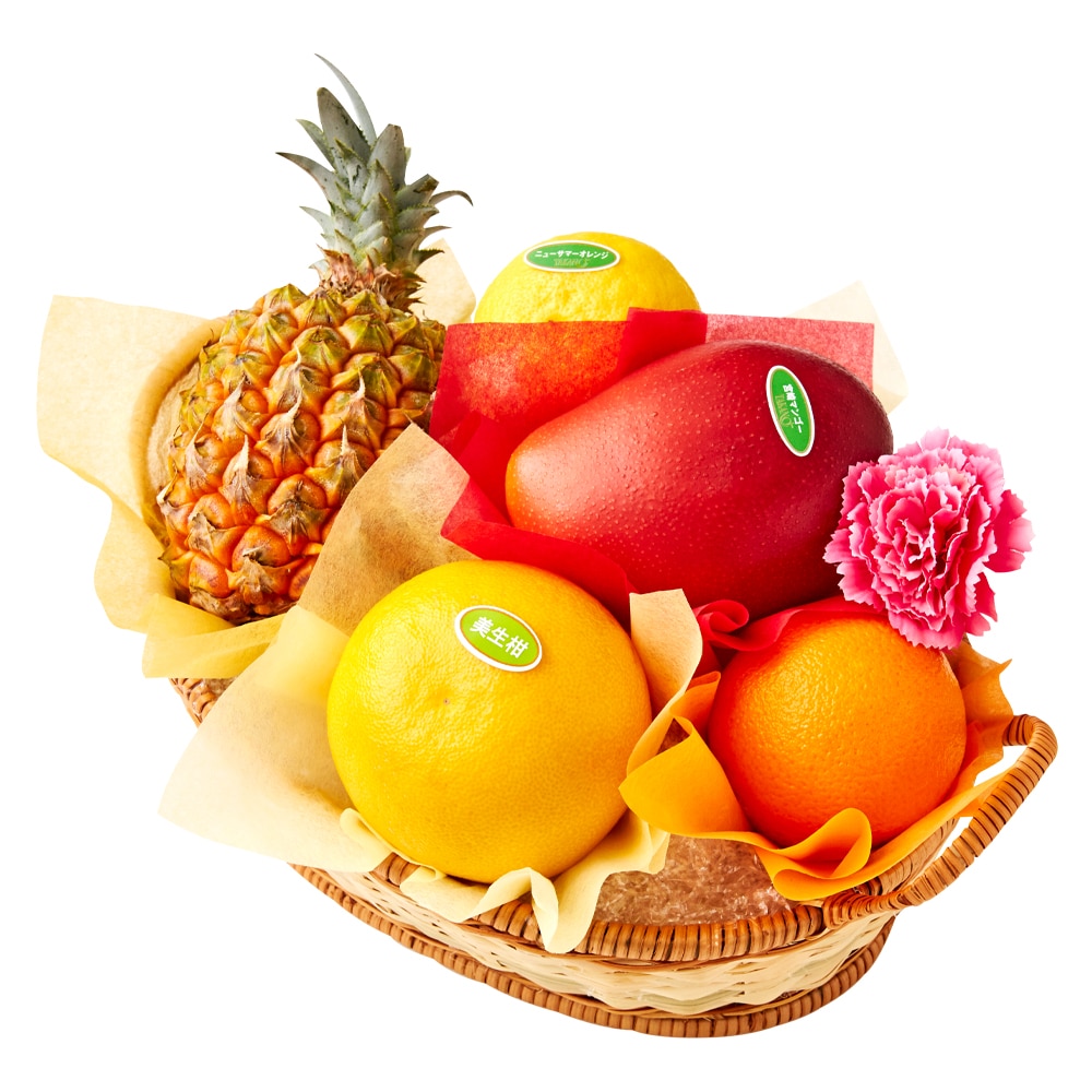 | 内容量 | 宮崎マンゴー(宮崎県産)、ミニパイン(沖縄県産)、美生柑(愛媛県または熊本県産)、ニューサマーオレンジ(愛媛県産)またはニューサマーグリーン(静岡県産)または小夏(高知県産)、オレンジ(アメリカまたはエジプト産)×各1、カーネーション(造花)×1(篭入) |