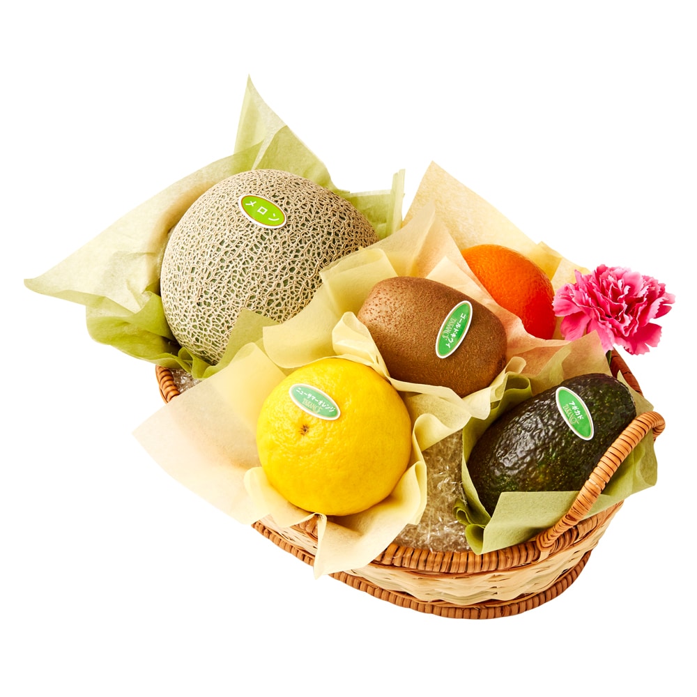 | 内容量 | メロン(熊本県、茨城県または千葉県産)、ニューサマーオレンジ(愛媛県産)またはニューサマーグリーン(静岡県産)または小夏(高知県産)、オレンジ(アメリカまたはエジプト産)、アボカド(メキシコ産)、サンゴールドキウイ(ニュージーランド)×各1、カーネーション(造花)×1(篭入) |