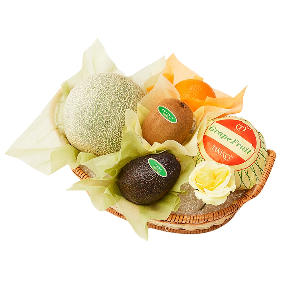 | 内容量 | メロン(千葉県、茨城県または山形県産)、グレープフルーツ(アメリカ、南アフリカまたはトルコ産)、オレンジ(アメリカ、オーストラリア、南アフリカまたはトルコ産)、キウイフルーツ(ニュージーランド産)、アボカド(メキシコまたはペルー産)×各1、バラ(造花)×1(篭入) |