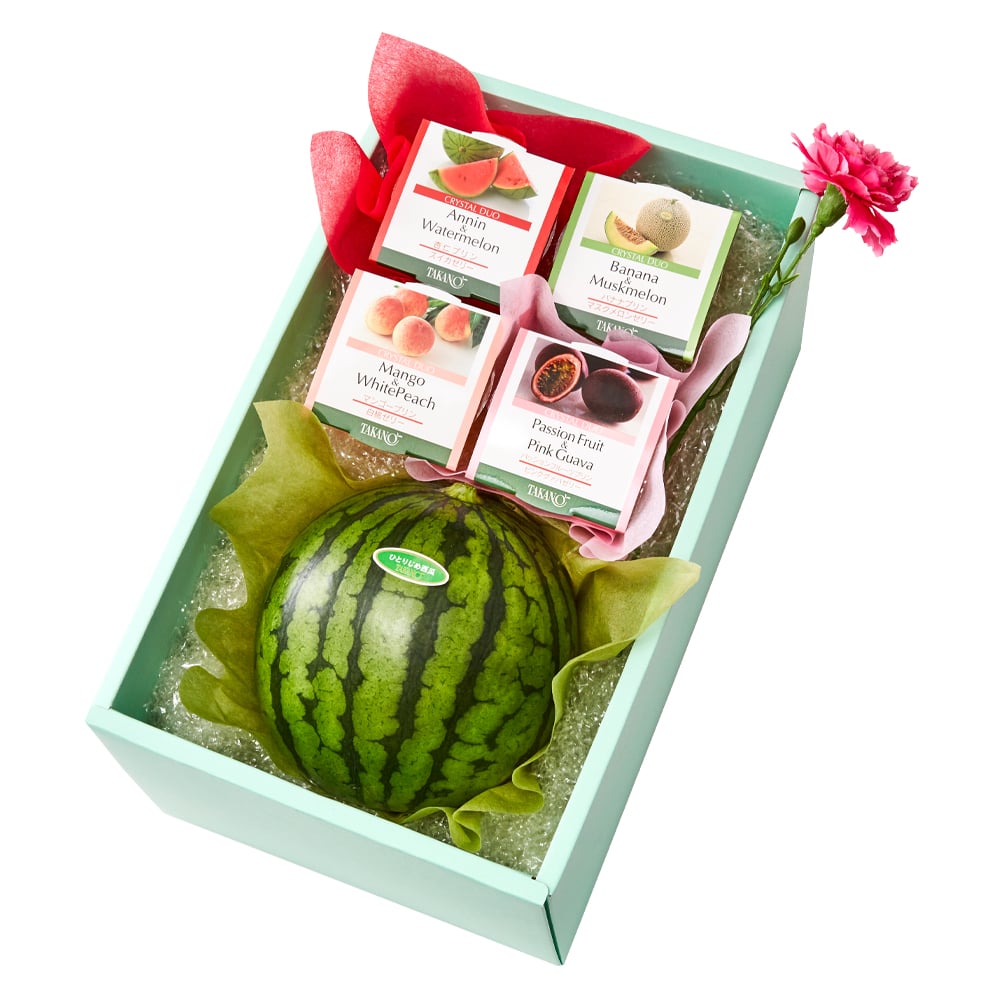 | 内容量 | 小玉西瓜(熊本県、群馬県または茨城県産)×1、クリスタルデュオ(杏仁プリン&スイカゼリー、バナナプリン&マスクメロンゼリー、マンゴープリン&白桃ゼリー、パッションフルーツプリン&ピンクグァバゼリー×各1)、カーネーション(造花)×1 |
