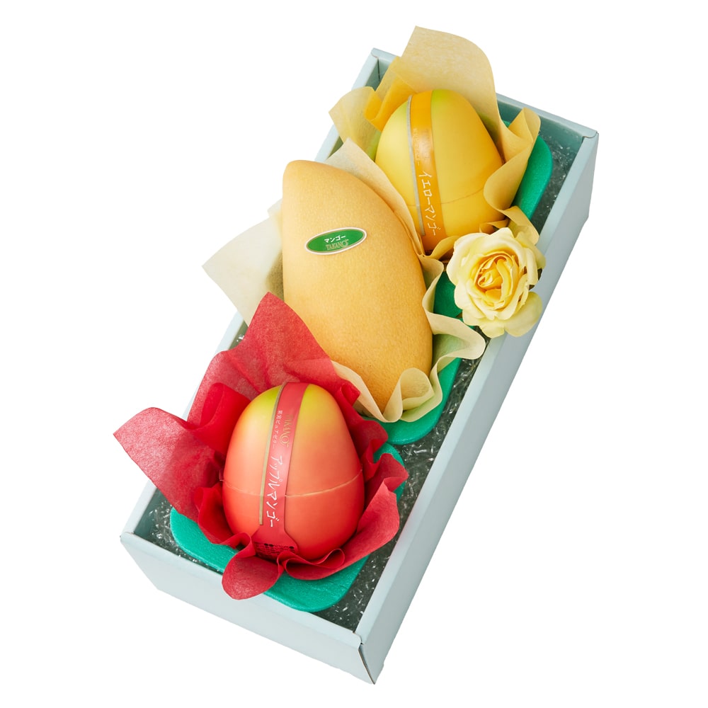 | 内容量 | タイマンゴー(タイ産)×1、果実ピュアゼリー(アップルマンゴー、イエローマンゴー×各1)、バラ(造花)×1*タイマンゴーには数種類の品種ある為、出荷時に品質、食味等の良い物をお詰めいたします。その為、画像と形状や色見等が異なる場合があります。 |