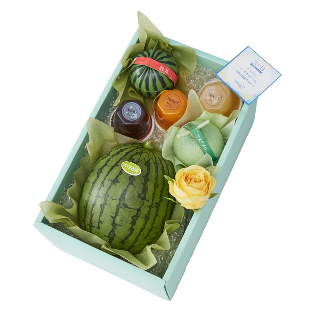 | 内容量 | 小玉西瓜(熊本県、群馬県または茨城県産)、果実ピュアゼリー(マスクメロン、西瓜×各1)、果実ゼリー(グレープ、パイン、アルフォンソマンゴー×各1)、バラ(造花)×1 |