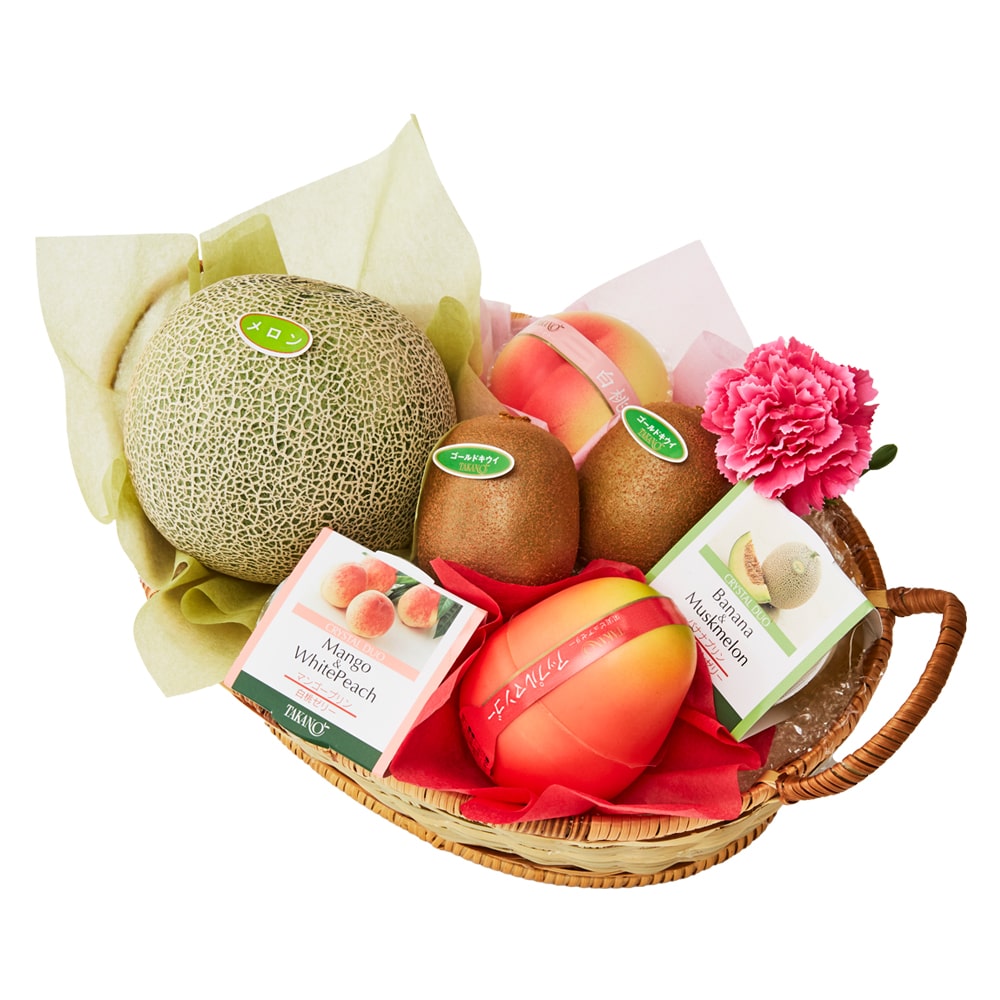| 内容量 | メロン(熊本県、茨城県または千葉県産)×1、サンゴールドキウイ(ニュージーランド産)×2、果実ピュアゼリー(アップルマンゴー、白桃×各1)、クリスタルデュオ(バナナプリン&マスクメロンゼリー、マンゴープリン&白桃ゼリー×各1)、カーネーション(造花)×1(篭入) |