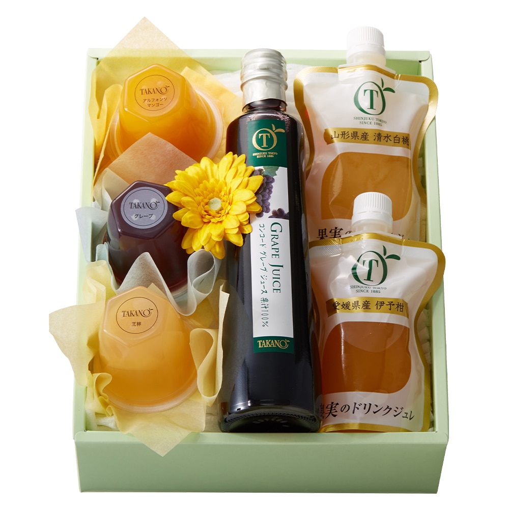 | 内容量 | 果実ゼリー(アルフォンソマンゴー、王林、グレープ×各1)、果実のドリンクジュレ(山形県産清水白桃、愛媛県産伊予柑×各1)、コンコードグレープジュース350ml、ガーベラオーナメント×各1 |