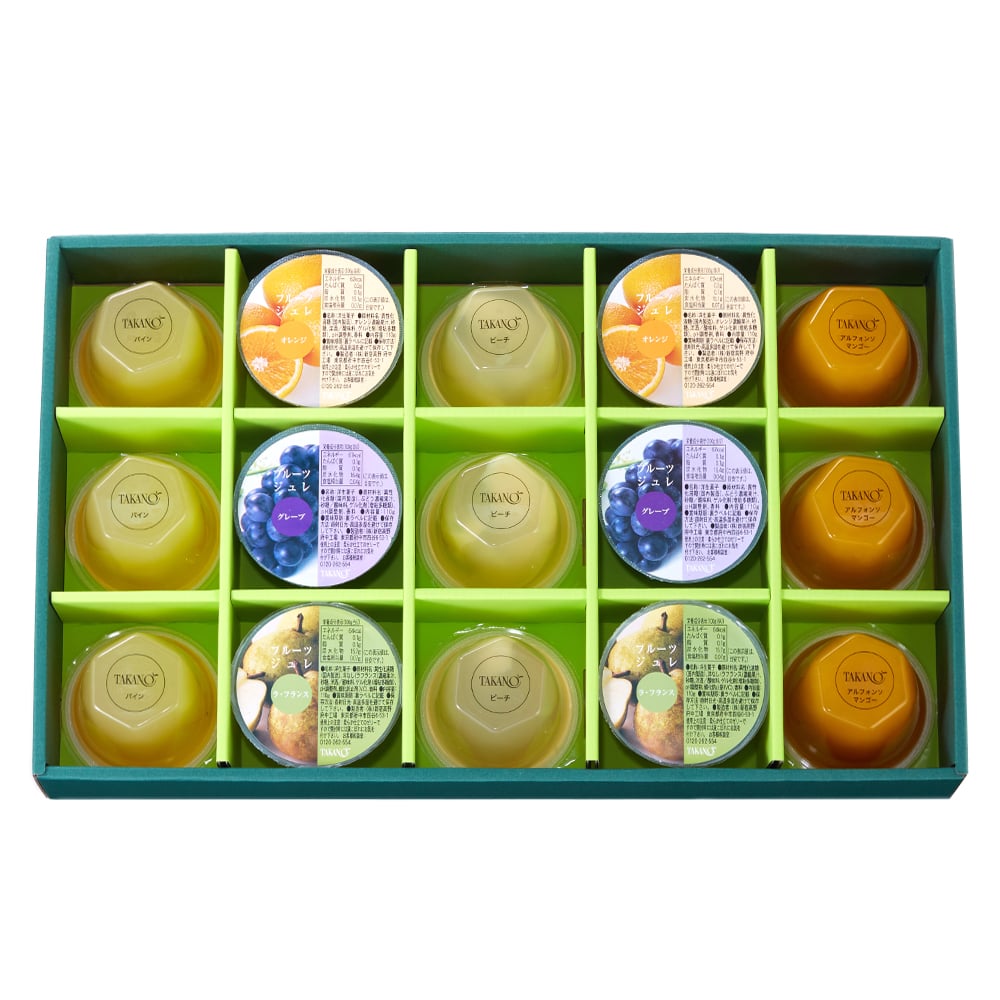 | 内容量 | 果実ゼリー(ピーチ、パイン、アルフォンソマンゴー×各3)、フルーツジュレ(ピンクグレープフルーツ、グレープ、ラ・フランス×各2) |