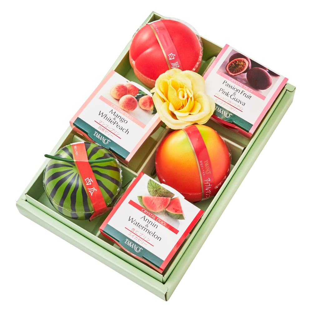 | 内容量 | 果実ピュアゼリー(西瓜、白鳳、アップルマンゴー×各1)、クリスタルデュオ(マンゴープリン&白桃ゼリー、杏仁プリン&スイカゼリー、パッションフルーツプリン&ピンクグァバゼリー×各1)、バラ(造花)×1 |