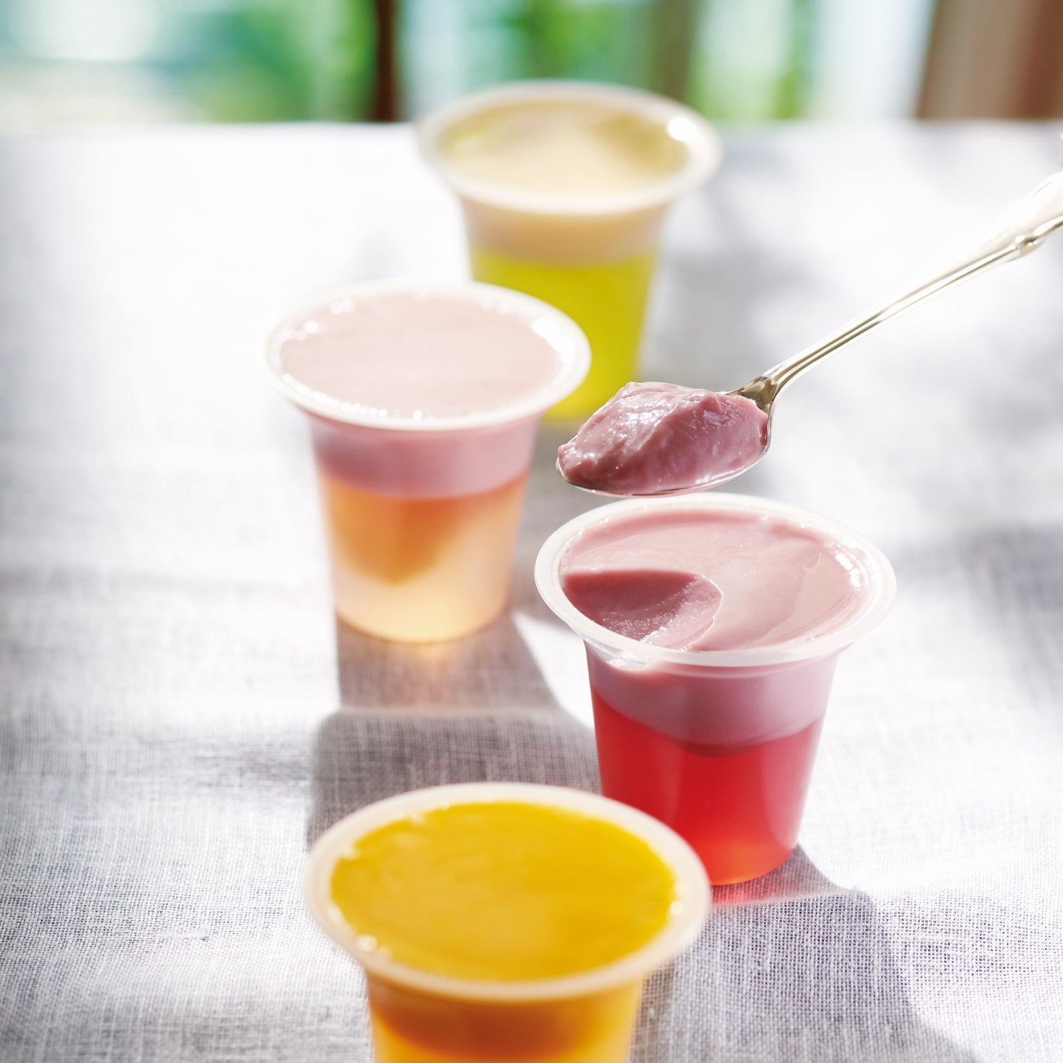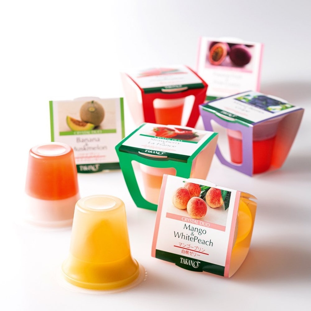 | 原材料 | ■果実ピュアゼリー●マスクメロン:加糖マスクメロンピューレ(国内製造)、異性化液糖、砂糖、洋酒/ゲル化剤(増粘多糖類)、グリシン、酸味料、pH調整剤、香料、乳化剤、着色料(クチナシ、青1、黄4) ●アップルマンゴー:マンゴーピューレ(台湾製造)、砂糖、洋酒(オレンジを含む)/ゲル化剤(増粘多糖類)、グリシン、酸味料、pH調整剤、乳化剤、香料 ●白桃:白ももシラップ漬け(国内製造)、砂糖、洋酒、白もも濃縮果汁/ゲル化剤(増粘多糖類)、グリシン、酸味料、pH調整剤、酸化防止剤(V.C)、乳化剤、香料 ●白鳳:加糖もも(国内製造)、ももピューレ、砂糖、洋酒/ゲル化剤(増粘多糖類)、グリシン、酸味料、pH調整剤、酸化防止剤(V.C)、乳化剤、香料■クリスタルデュオ●バナナプリン&マスクメロンゼリー:砂糖(国内製造)、乳等を主要原料とする食品(卵を含む)、加糖マスクメロンピューレ、還元水あめ、バナナピューレ、洋酒/ゲル化剤(増粘多糖類)、グリシン、pH調整剤、酸味料、乳化剤、酸化防止剤(V.C、糖転移ルチン)、香料、着色料(クチナシ、カロチン)●ミックスベリープリン&グレープゼリー:還元水あめ(インドネシア製造)、砂糖、乳等を主要原料とする食品(卵を含む)、油脂加工食品、ぶどうシラップ漬け、いちごピューレ、ぶどう濃縮果汁、発酵乳、ブルーベリー濃縮果汁/ゲル化剤(増粘多糖類)、グリシン、pH調整剤、酸味料、乳化剤(大豆由来)、着色料(クチナシ、野菜色素)、香料、酸化防止剤(V.C)、乳酸Ca |