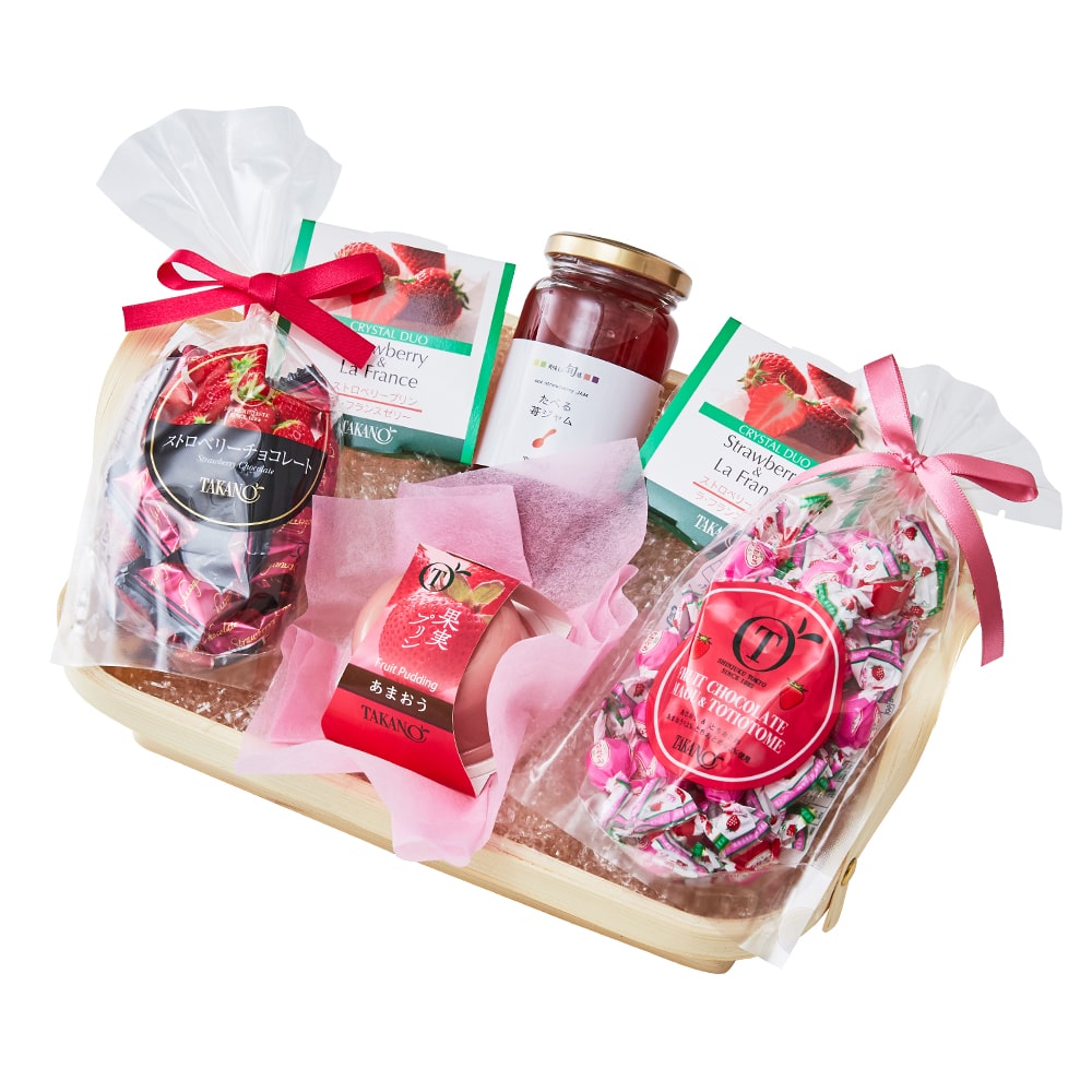 | 内容量 | クリスタルデュオ(ストロベリープリン&ラ・フランスゼリー)×2、果実プリン(あまおう)×1、あまおう&とちおとめチョコレートSPリボン65g(個包装紙込み)、ストロベリーチョコレートSPリボン55g(個包装紙込み)、たべる苺ジャム160g×各1(篭入) |