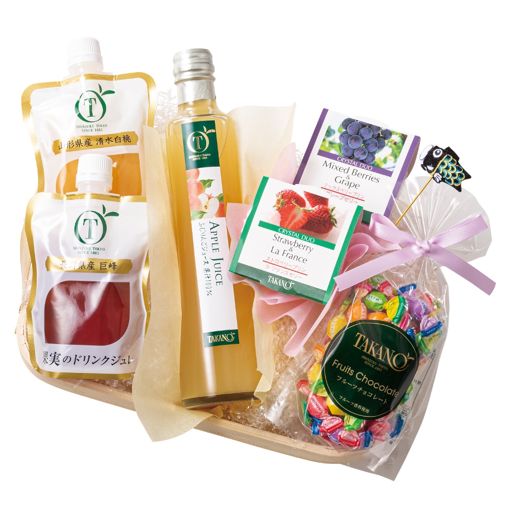 | 内容量 | 果実のドリンクジュレ(長野県産巨峰、山形県産清水白桃×各1)、ふじりんごジュース 350ml×1、フルーツチョコレートSPリボン80g(個包装紙込み)×1、クリスタルデュオ(ミックスベリープリン&グレープゼリー、ストロベリープリン&ラ・フランスゼリー×各1)、鯉のぼりピック(ちりめん素材使用)×1(篭入) |