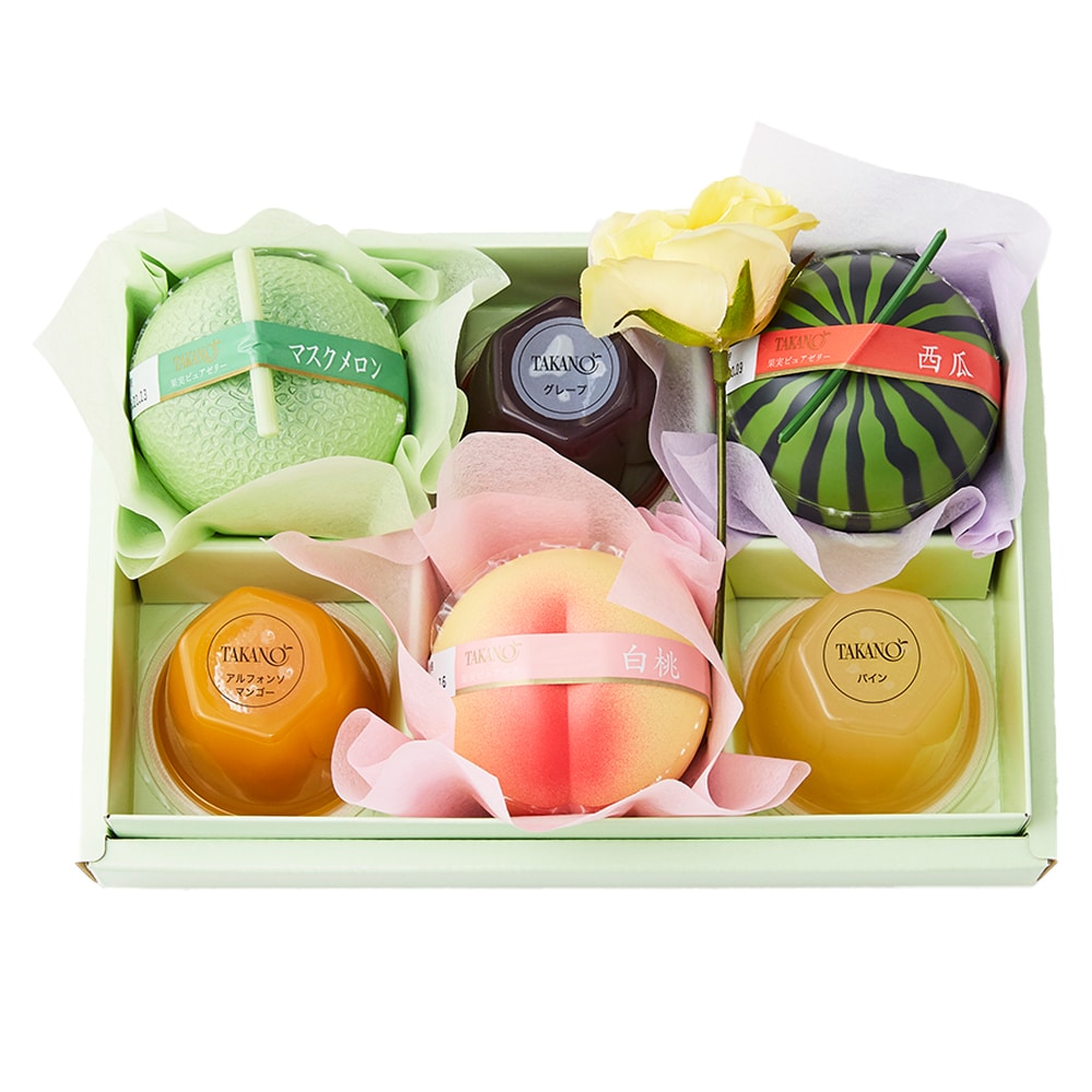 | 内容量 | 果実ピュアゼリー(白桃、マスクメロン、西瓜×各1)、果実ゼリー(グレープ、パイン、アルフォンソマンゴー×各1)、バラ(造花)×1 |