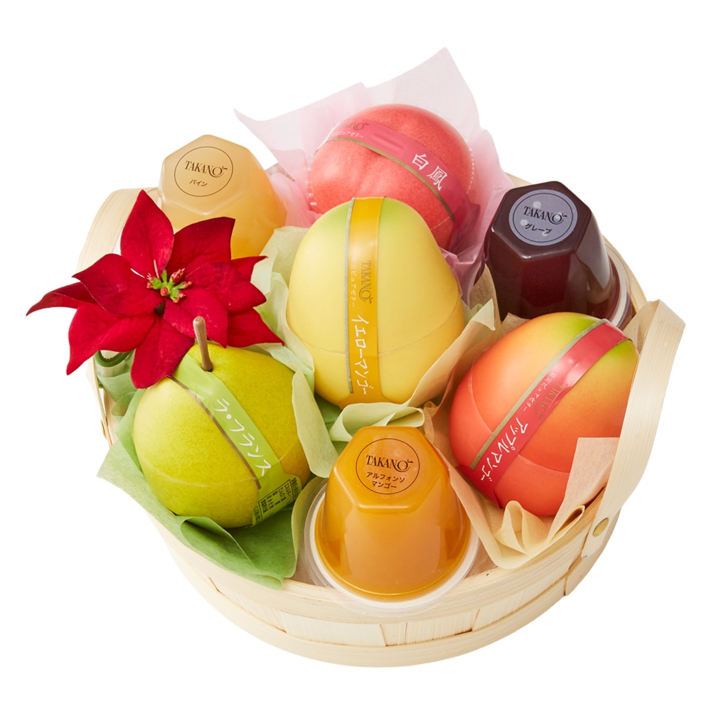 | 内容量 | 果実ピュアゼリー(ラ・フランス、白鳳、アップルマンゴー、イエローマンゴー×各1)、果実ゼリー(アルフォンソマンゴー、グレープ、パイン×各1)、ポインセチア(造花)×1(篭入) |