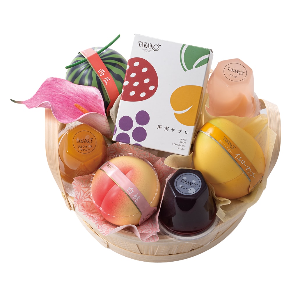 | 内容量 | 果実ピュアゼリー(白桃、西瓜、イエローマンゴー×各1)、果実ゼリー(ピーチ、グレープ、アルフォンソマンゴー×各1)、果実サブレ5枚入、カラーオーナメント×各1 |
