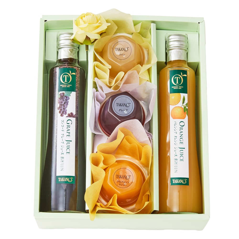 | 内容量 | ジュース 350ml(バレンシアオレンジ、コンコードグレープ×各1)、果実ゼリー(パイン、グレープ、アルフォンソマンゴー×各1)、バラ(造花)×1 |