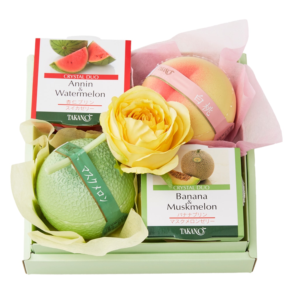 | 内容量 | 果実ピュアゼリー(マスクメロン、白桃×各1)、クリスタルデュオ(バナナプリン&マスクメロンゼリー、杏仁プリン&スイカゼリー×各1)、バラ(造花)×1 |
