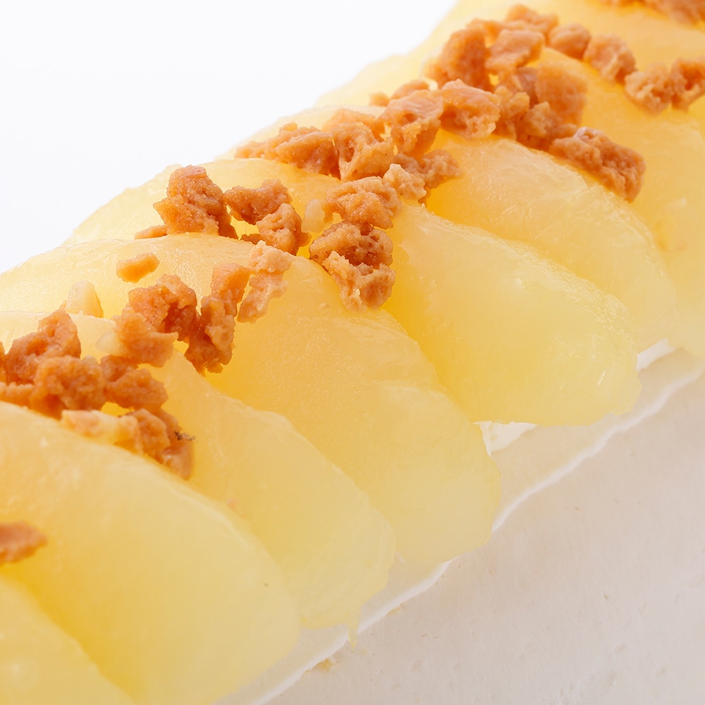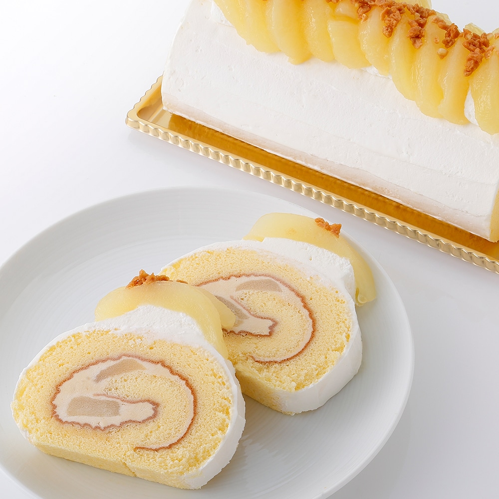 | ラ・フランスのシラップ漬けをキャラメル風味のホイップクリームで巻き上げたロールケーキ。 |