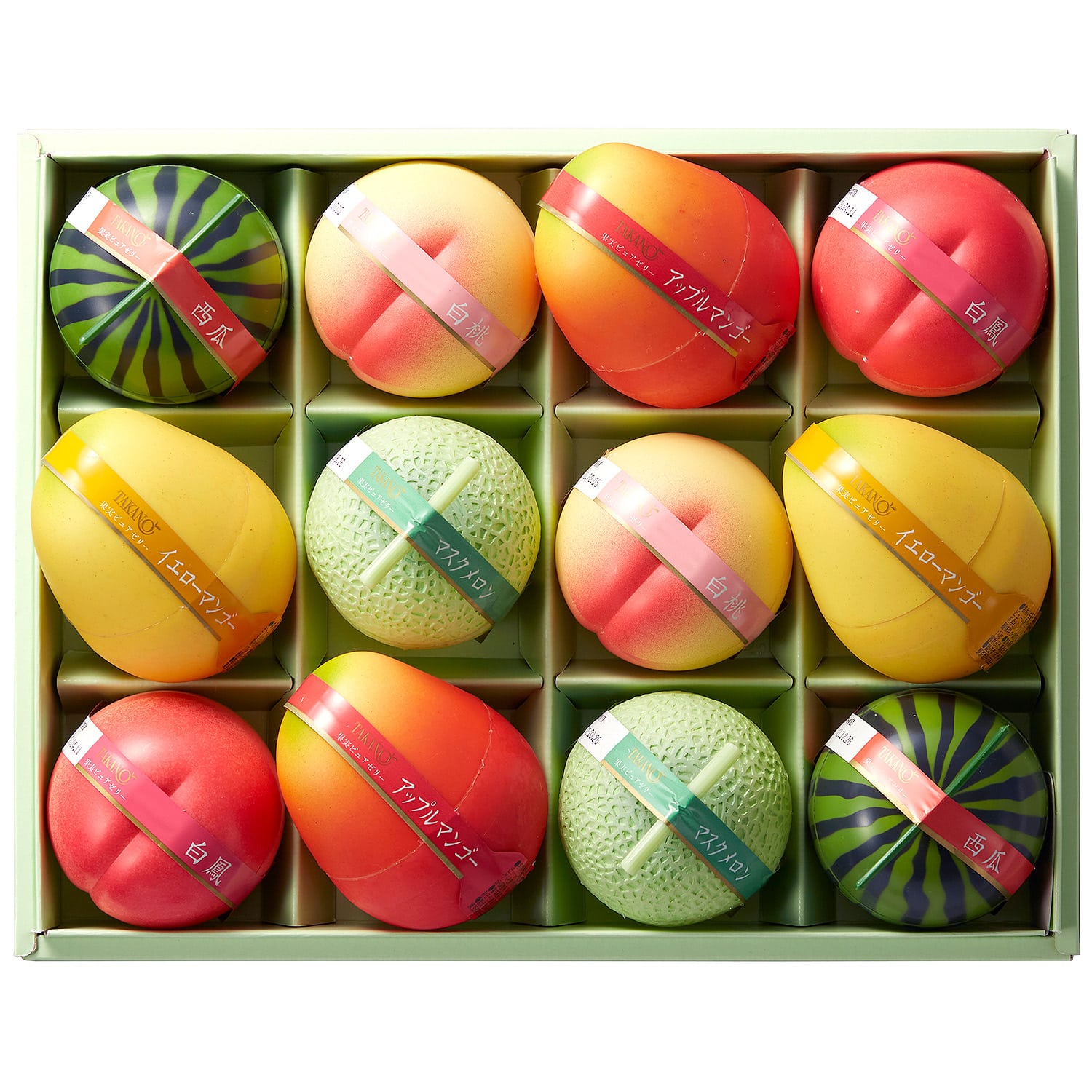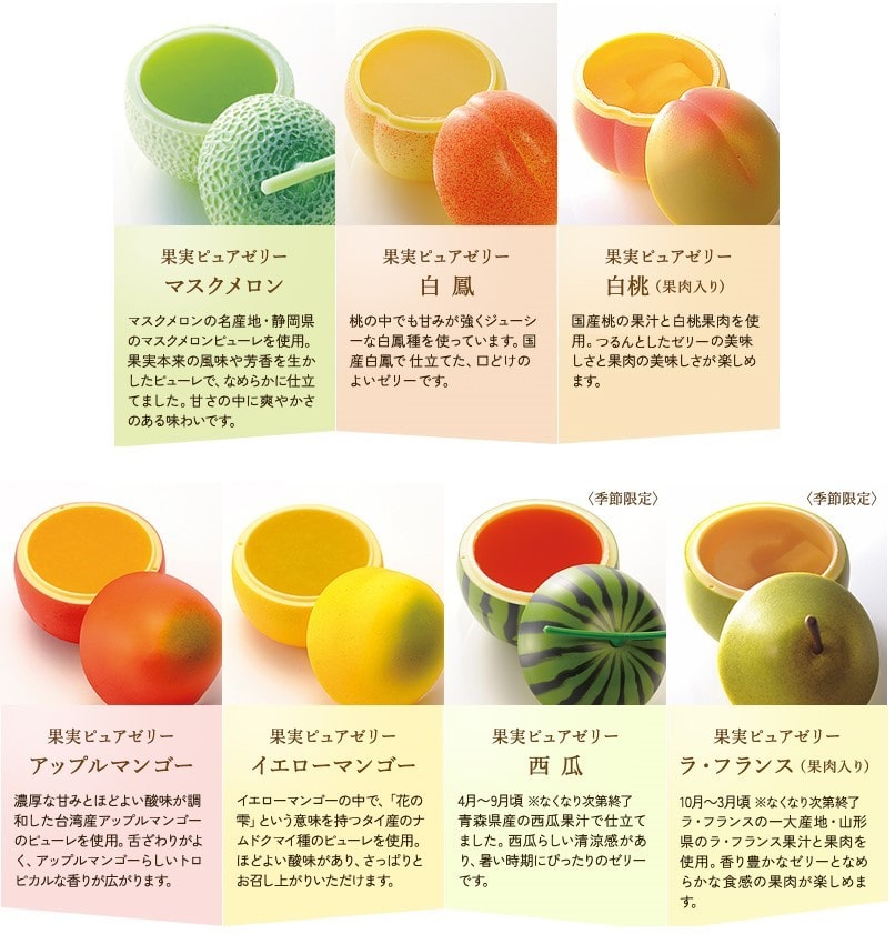| 原材料 | ●マスクメロン:加糖マスクメロンピューレ(国内製造)、異性化液糖、砂糖、洋酒/ゲル化剤(増粘多糖類)、グリシン、酸味料、pH調整剤、香料、乳化剤、着色料(クチナシ、青1、黄4)●アップルマンゴー:マンゴーピューレ(台湾製造)、砂糖、洋酒(オレンジを含む)/ゲル化剤(増粘多糖類)、グリシン、酸味料、pH調整剤、乳化剤、香料●イエローマンゴー:マンゴーピューレ(国内製造)、異性化液糖、砂糖、洋酒(オレンジを含む)/グリシン、ゲル化剤(増粘多糖類)、酸味料、pH調整剤、乳化剤、香料●西瓜:スイカ果汁(国内製造)、異性化液糖、砂糖、洋酒/ゲル化剤(増粘多糖類)、グリシン、酸味料、pH調整剤、着色料(紅麹、赤40)、香料、乳化剤●白鳳:加糖もも(国内製造)、ももピューレ、砂糖、洋酒/ゲル化剤(増粘多糖類)、グリシン、酸味料、pH調整剤、酸化防止剤(V.C)、乳化剤、香料●白桃:白ももシラップ漬け(国内製造)、砂糖、洋酒、白もも濃縮果汁/ゲル化剤(増粘多糖類)、グリシン、酸味料、pH調整剤、酸化防止剤(V.C)、乳化剤、香料 |