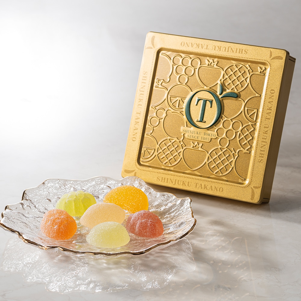 | フルーツ5種のジェリーに140周年を記念してマスクメロンジェリーを加えた期間限定缶。 |