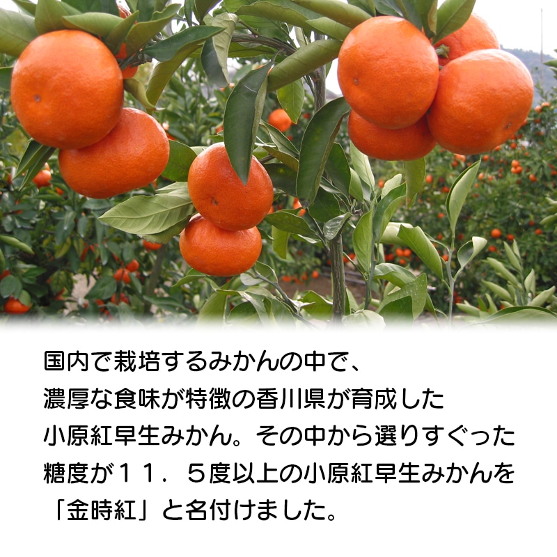 国内で栽培するみかんの中で、濃厚な食味が特徴の香川県が育成した小原紅早生みかん。その中から選りすぐった、糖度が11.5度以上の小原紅早生みかんを「金時紅」と名付けました。【商品提供者コメント】
