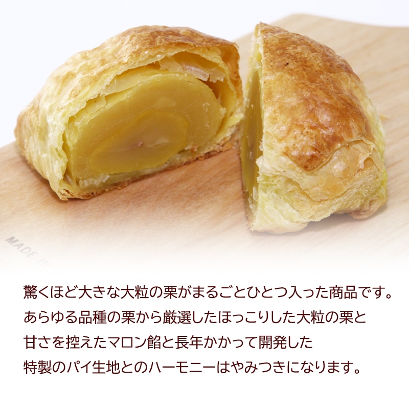 驚くほど大きな大粒の栗がまるごとひとつ入った商品です。ほっこりした大粒の栗と、甘さを控えたマロン餡と特製のパイ生地とのハーモニーはやみつきになります。【商品提供者コメント】