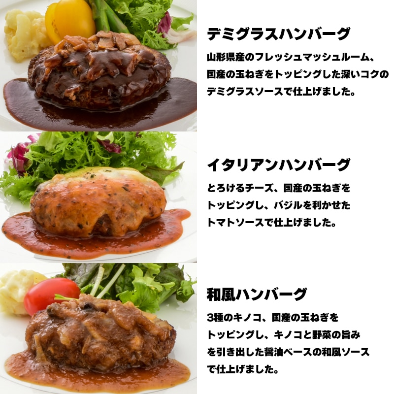 ●商品内容/デミグラスハンバーグ・イタリアンハンバーグ・和風ハンバーグ 各150g(固形量105g)×3