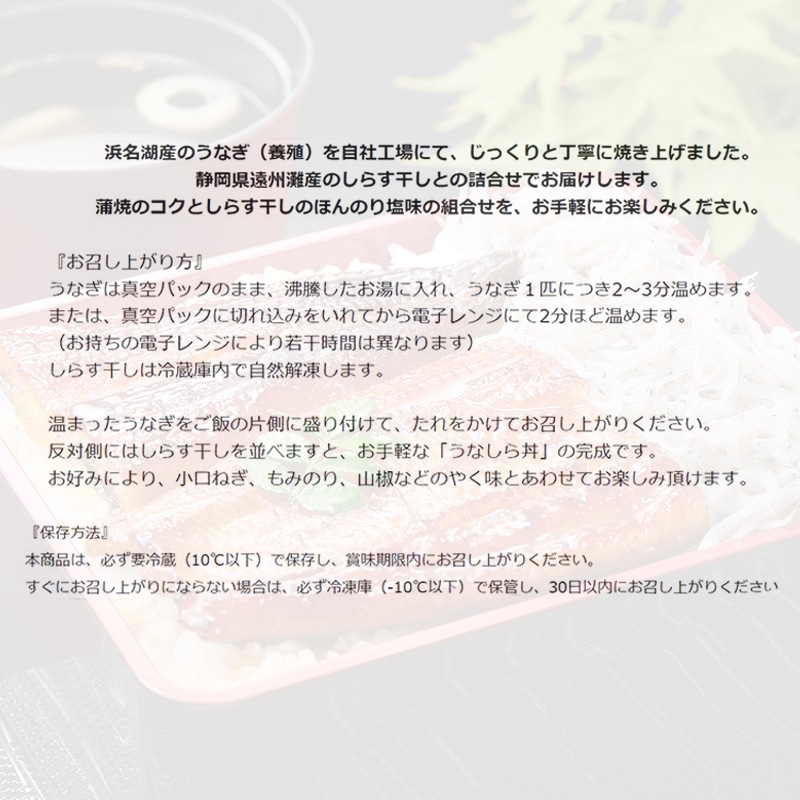 ●商品内容/蒲焼200g(2本)、(蒲焼のたれ20ml・山椒0.2g)×2、しらす干し40g×2