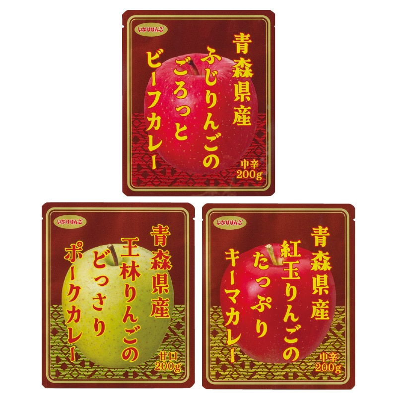 ●商品内容/ふじりんごのごろっとビーフカレー・王林りんごのどっさりポークカレー・紅玉りんごのたっぷりキーマカレー 各200g