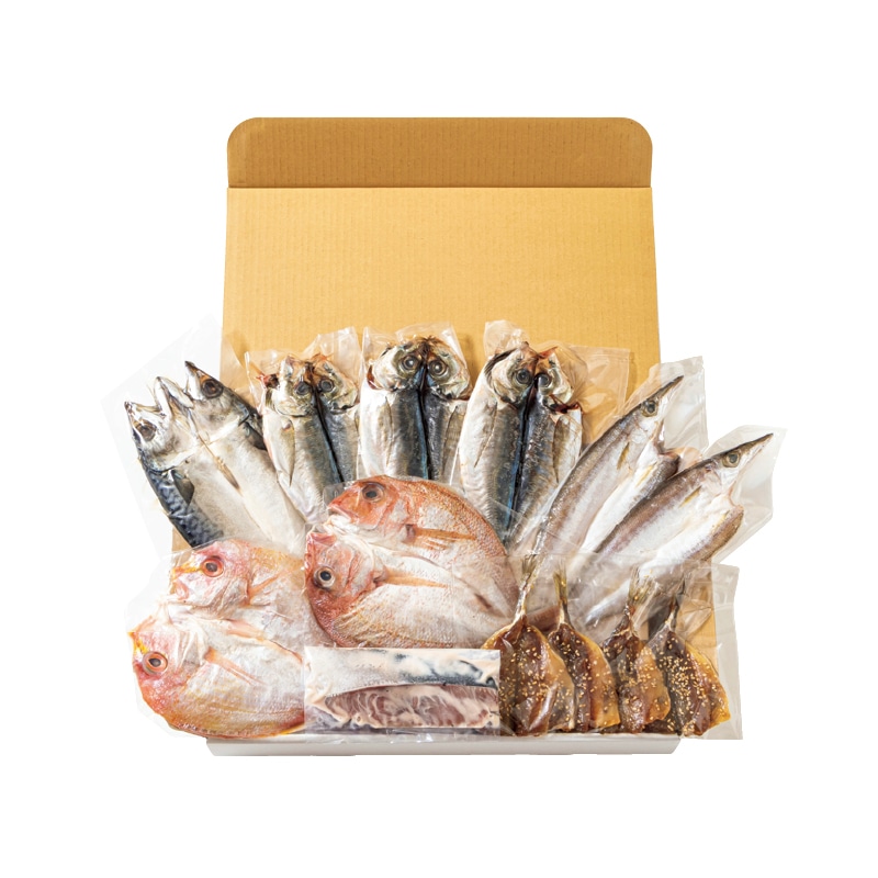 ●商品内容/真あじの干物70g×3、れんこ鯛の干物・真鯛の干物 各140g、かますの干物70g×2、真さばの干物150g、あじみりん20g×4、ぶり切身粕漬80g