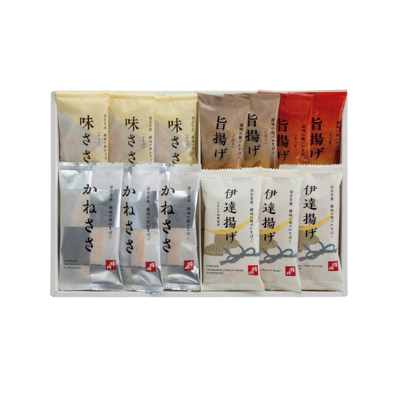 ●商品内容/かねささ・伊達揚げ・味ささ(チーズ) 各3枚、旨揚げ(さつま・ごぼう 各2枚)