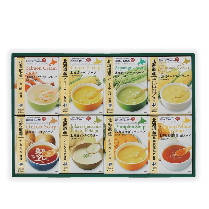 ●商品内容/サーモンクリーム17.2g×4、インカのめざめ20g×4、コーン・アスパラ・かぼちゃ・チーズコーン 各16.5g×4、オニオン・札幌黄玉ねぎ 各7g×4
