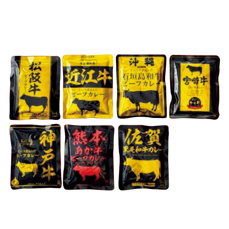 ●商品内容/ビーフカレー(佐賀黒毛和牛・石垣島和牛・宮崎牛・松阪牛・近江牛・熊本あか牛・神戸牛 各160g)