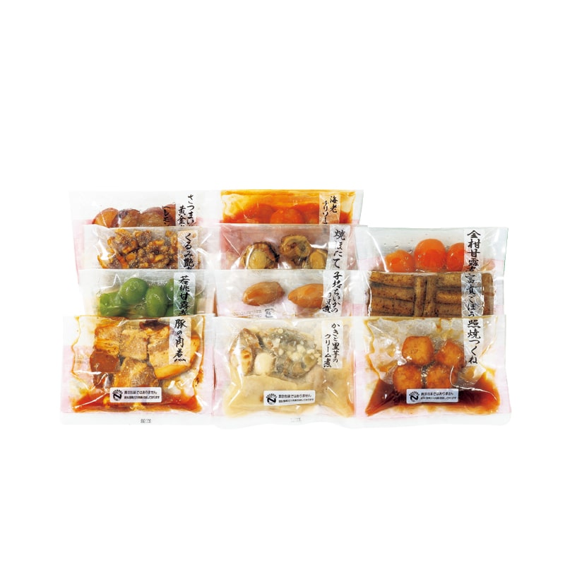 ●商品内容/富貴ごぼう50g、金柑甘露煮70g、焼ほたて3個、子持ちいかのうま煮2個、くるみ艶煮35g、若桃甘露煮5個、さつまいも黄金煮(レモン煮)80g、海老チリソース煮4尾、かきと里芋のクリーム煮85g、照焼つくね60g、豚の角煮65g