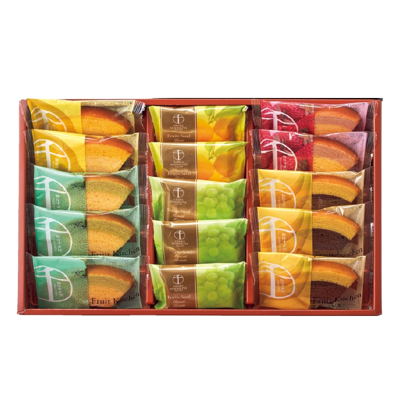 ●商品内容/銀座フルーツクーヘン(イチゴ&ミルク・レモン&はちみつ 各2個、メロン&ミルク・バナナ&チョコ 各3個)、銀座フルーツサンド(柚子2個、マスカットレーズン3個)