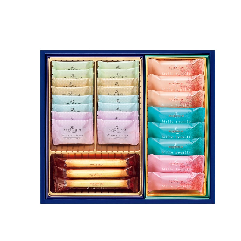繊細な食感とバターの風味豊かな定番「ヴィーナービッセン」と「ツィガレッテン」、3種のフレーバーを楽しめるローゼンハイムの冬の定番「ミルフィーユ」を詰合せたギフトセットです。【商品提供者コメント】
