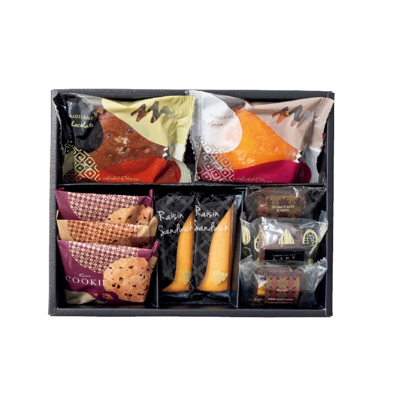●商品内容/レーズンサンド・レーズンクッキー 各2個、ブラウニー(ネーブル・ドライフルーツ&ナッツ 各1個)、マドレーヌ(プレーン・チョコ 各1個)、チョコレートケーキ・チョコチップクッキー 各1個