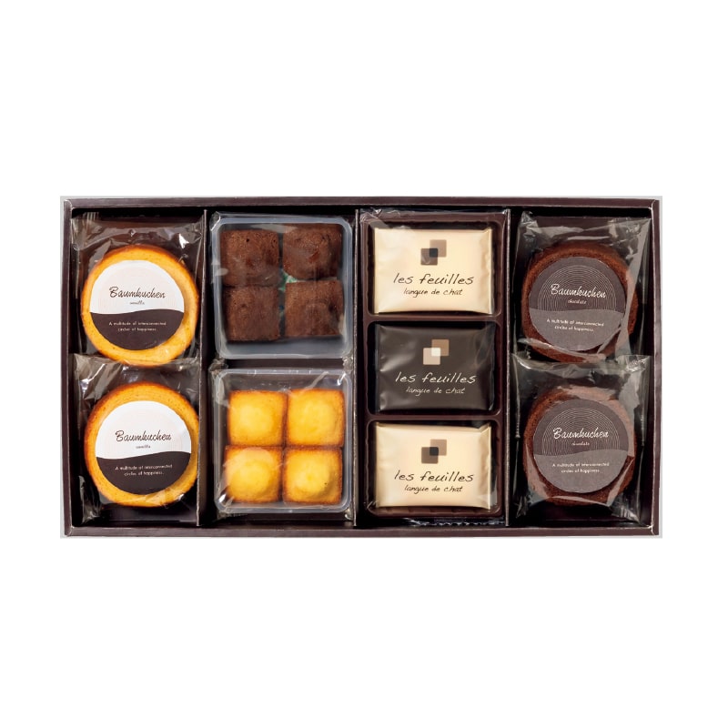 ●商品内容/バウムクーヘン(プレーン・チョコ 各2個)、フィナンシェ(プレーン・チョコ 各4個)、ラングドシャ(プレーン4枚、チョコ2枚)