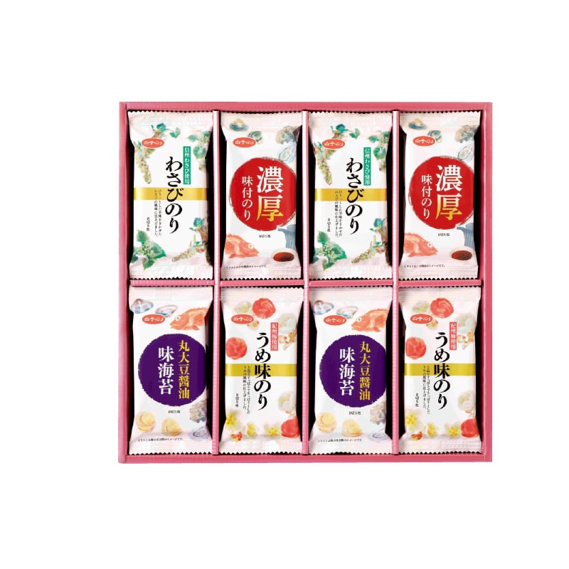●商品内容/信州わさび使用わさびのり・濃厚味付のり・丸大豆醤油味のり・紀州梅使用うめ味のり 各8切5枚(板のり0.625枚分)×4