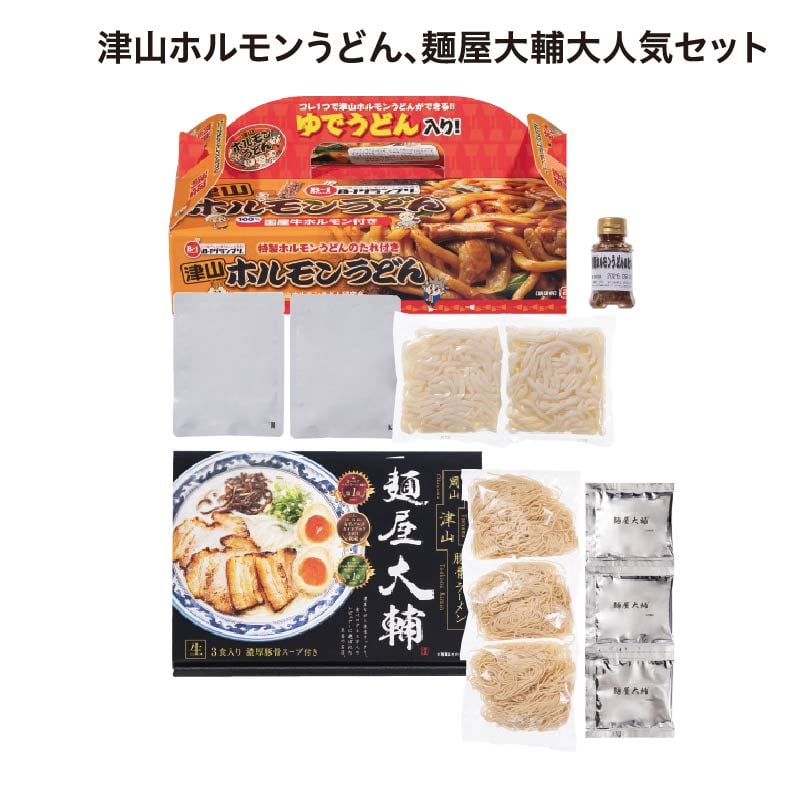 ●商品内容/津山ホルモンうどんセット(ホルモンうどんのたれ125g、牛もつ煮70g・ゆでめん200g 各2)、麺屋大輔(生めん110g・スープ36g 各3)