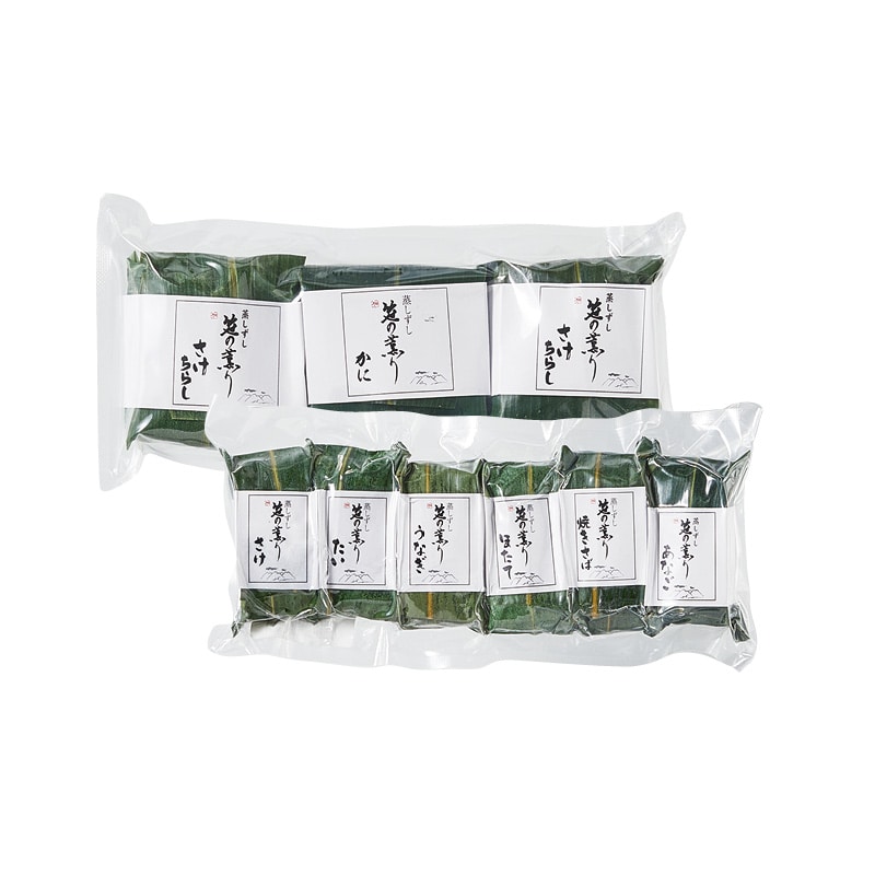 ●商品内容/笹巻ちらし(さけ2個、かに1個)、笹巻寿司(さけ・あなご・たい・うなぎ・ほたて・焼きさば 各1個)