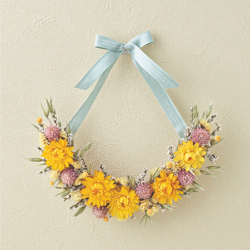 ●商品内容/サイズ(約)=幅23×奥行4×高さ20cm 素材=花材/ドライ:ヘリクリサム、千日紅、アマレリーノ、カラス麦、スターチス リースベース/小枝