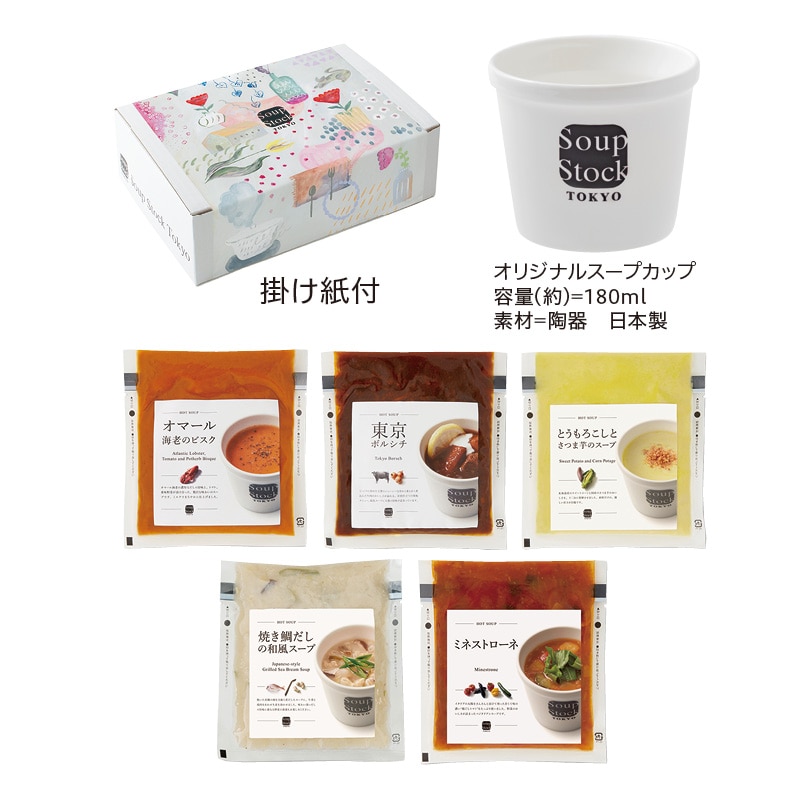●商品内容/オマール海老のビスク・東京ボルシチ・焼き鯛だしの和風スープ・ミネストローネ・とうもろこしとさつま芋のスープ 各180g、スープストックトーキョーオリジナルスープカップ(1個)付 容量(約)=180ml 素材=陶器 日本製