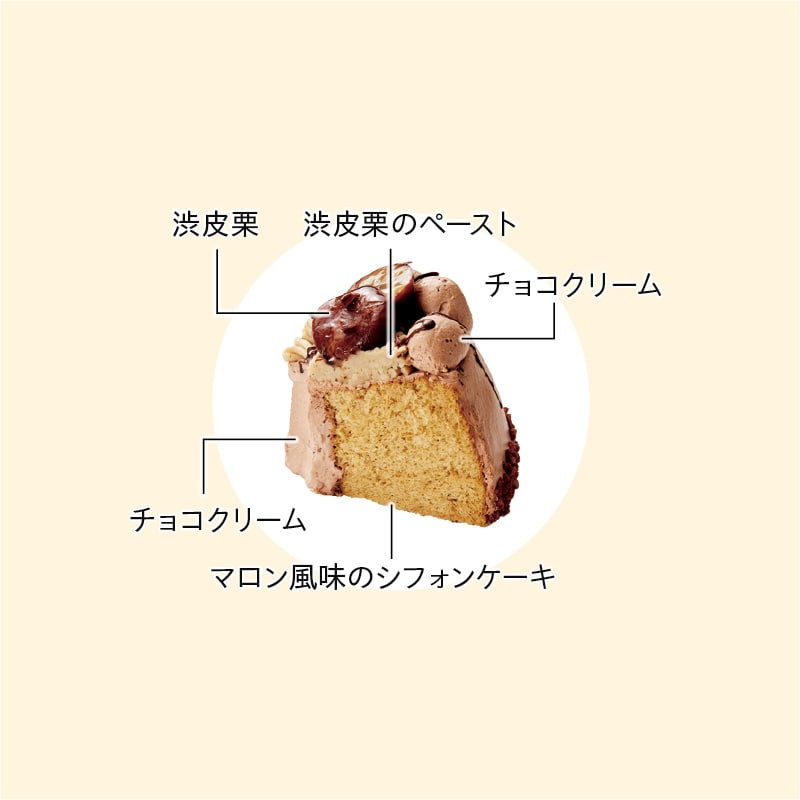 ふわふわ食感のシフォンケーキをたっぷりの濃厚チョコクリームで包み込みました。味わい深い渋皮栗のペーストをたっぷり絞り、マロンとチョコクリームのデコレーションで仕上げたクリスマスケーキです。【商品提供者コメント】