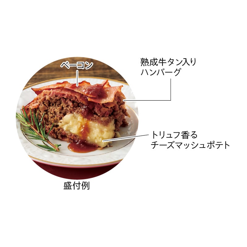 総重量約1kg!迫力のあるビジュアルでクリスマスの食卓が華やぎます。トリュフ入りのチーズマッシュポテトが入ったハンバーグをベーコンで包みました。特製辛口ダレをかけてお召し上がりください。【商品提供者コメント】