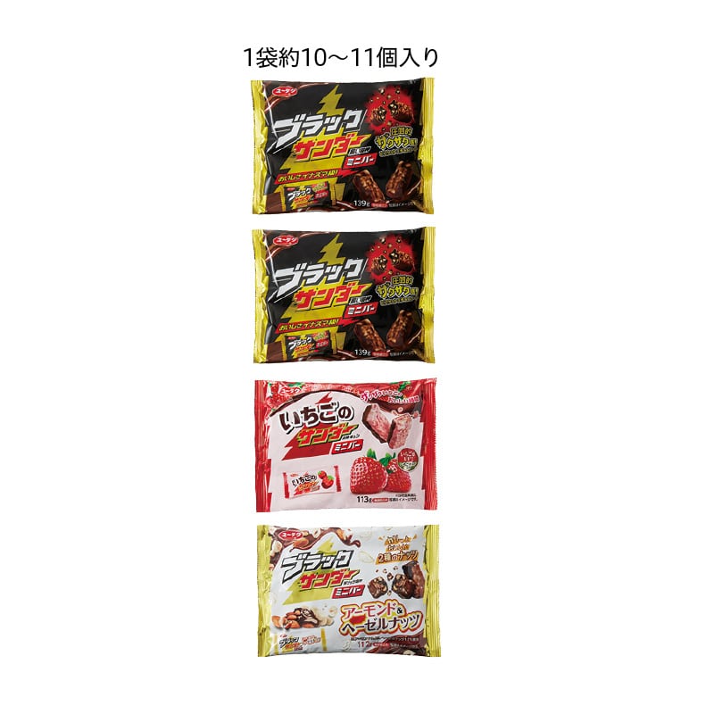 ●商品内容/ブラックサンダーミニバー139g(個装紙込)×2、いちご113g(個装紙込)、アーモンド&ヘーゼルナッツ112g(個装紙込)、小分袋付(4枚)