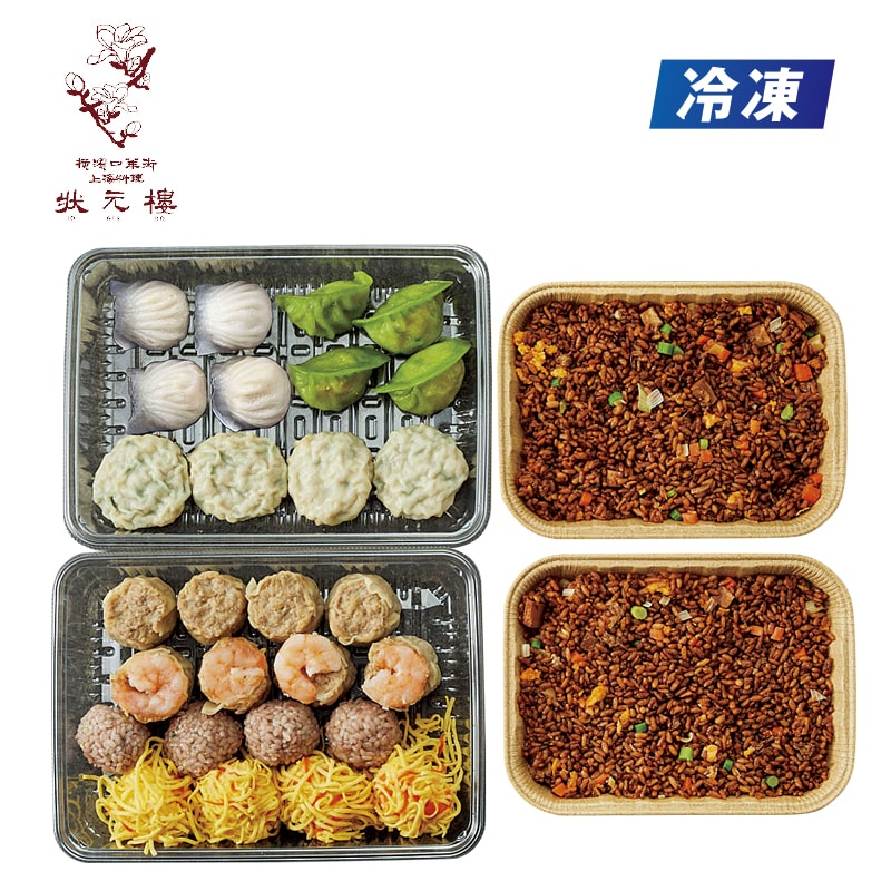 ●商品内容/肉焼売35g・海老焼売35g・紫もち米焼売30g・海鮮団子30g・海老ニラ焼きまんじゅう30g・翡翠蒸し餃子22g・海老蒸し餃子22g 各4個、黒醤油チャーハン270g×2