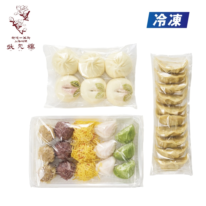 ●商品内容/肉焼売35g×3、紫もち米焼売・海鮮団子 各30g×3、海老蒸し餃子・翡翠蒸し餃子 各22g×3、ミニ肉まんじゅう・ミニ桃まんじゅう 各40g×3、ハーブ豚餃子23g×10