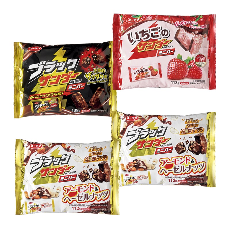 ●商品内容/ブラックサンダーミニバー139g(個装紙込)、いちご113g(個装紙込)、アーモンド&ヘーゼルナッツ112g(個装紙込)×2