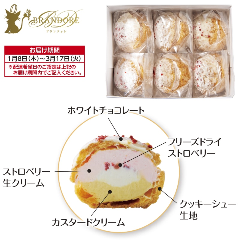 少ししっかり目に焼いたクッキーシューに、カスタードクリームと苺のホイップクリームを詰め、ホワイトチョコとフリーズドライストロベリーをトッピングしました。【商品提供者コメント】